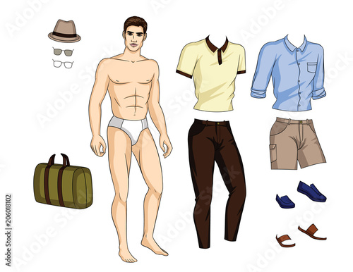 Vector Illustration Of Paper Doll Man With Set Of Stylish Summer